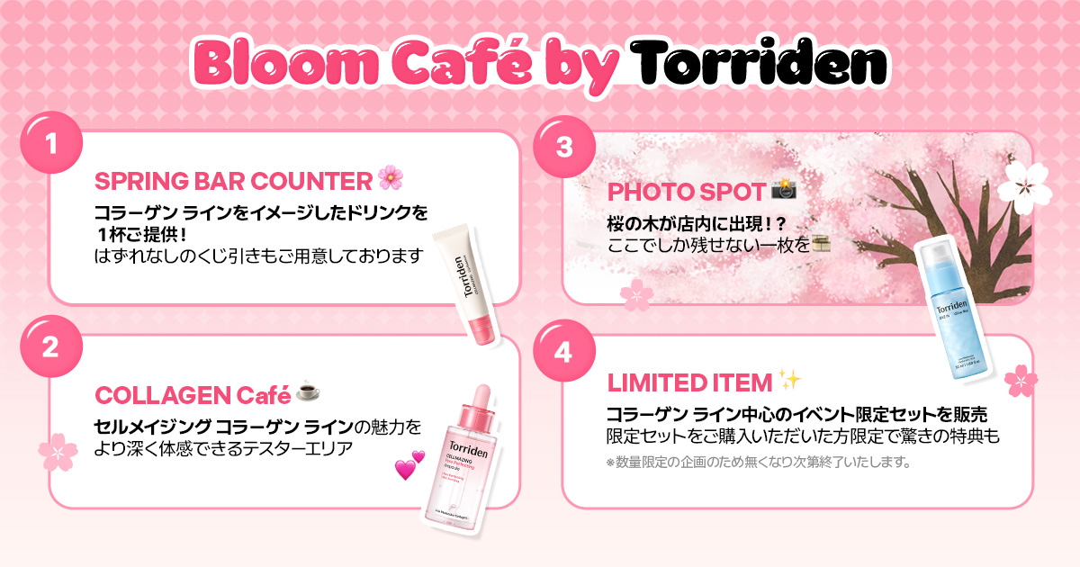 マルマンH&B株式会社(本社:東京都千代田区、代表取締役社長:溝田 勝彦)が展開する韓国スキンケアブランド「Torriden(トリデン)」は、2026年4月29日(水・祝)~5月10日(日)の期間限定で、渋谷「OPENBASE SHIBUYA」にて桜とピンクをテーマとしたポップアップストア『Bloom Café by Torriden』をオープンいたします。本ポップアップストアではセルメイジング コラーゲン※1 ラインのピンクをモチーフにしたドリンクの提供や店内でお花見ができるダイナミックな桜の木の設置、新商品を含む限定セットの販売をいたします。