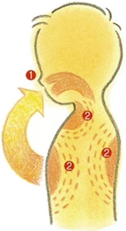①吸入作用 ヴイックス ヴェポラッブの有効成分が、体温で温められて蒸気となり、鼻や口から吸入されて、呼吸をスースー楽にします。