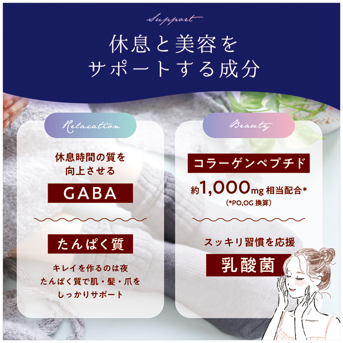 ■GABA:神経の高ぶりを抑える働きがあるアミノ酸で、リラックスを促す成分として知られています。おやすみ前の穏やかな時間を意識して配合しました。