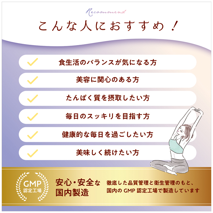 ■大豆たんぱく:毎日の食生活で不足しがちな植物性たんぱく質を補えるよう配合。美容や健康を意識する方におすすめです。