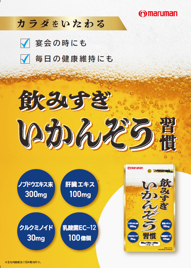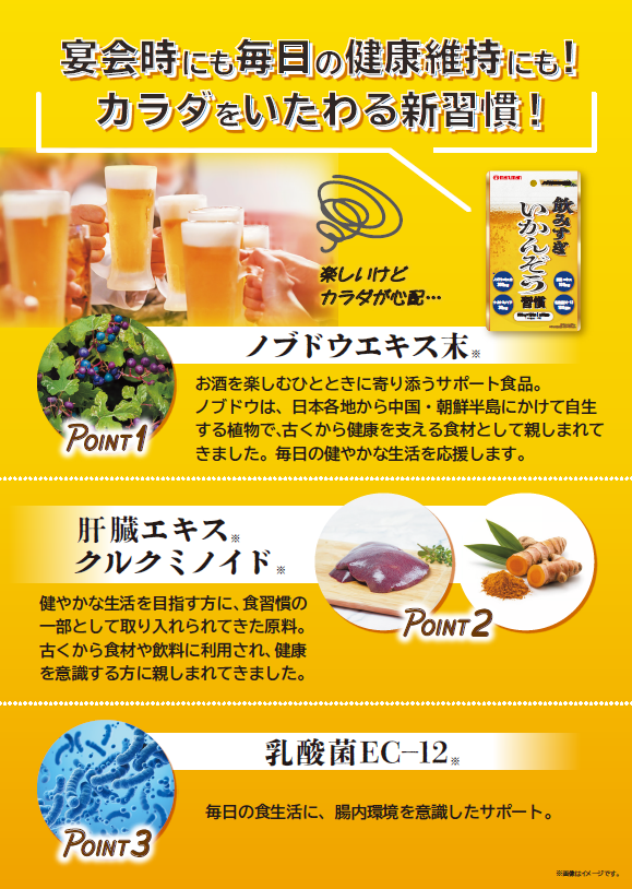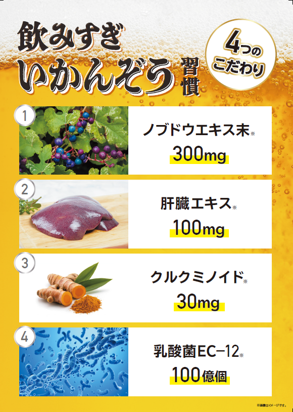 日本だけでなく、中国・朝鮮半島でも古くから健康を支える食材として親しまれてきたノブドウエキス末を中心に、肝臓エキス、クルクミノイド、乳酸菌EC-12を贅沢に配合しました。